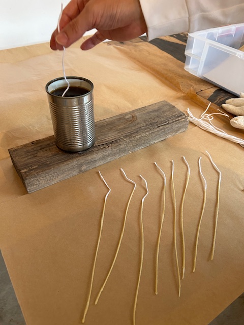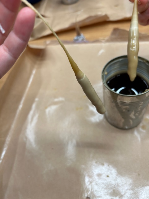 最初は細い芯も、溶けた蝋の中に浸けて出す。浸けては出してを繰り返していくと少しずつ形になってきます。