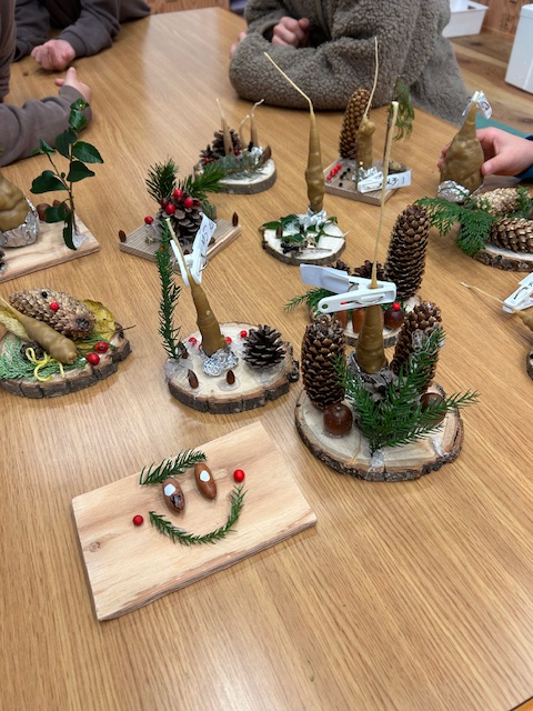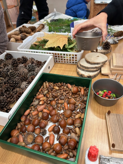 飾り付けも山で拾ったまつぼっくりやどんぐり、赤い実、青々とした葉、色もクリスマスを感じられる自然の素材がたくさん並びとても豊かでした。